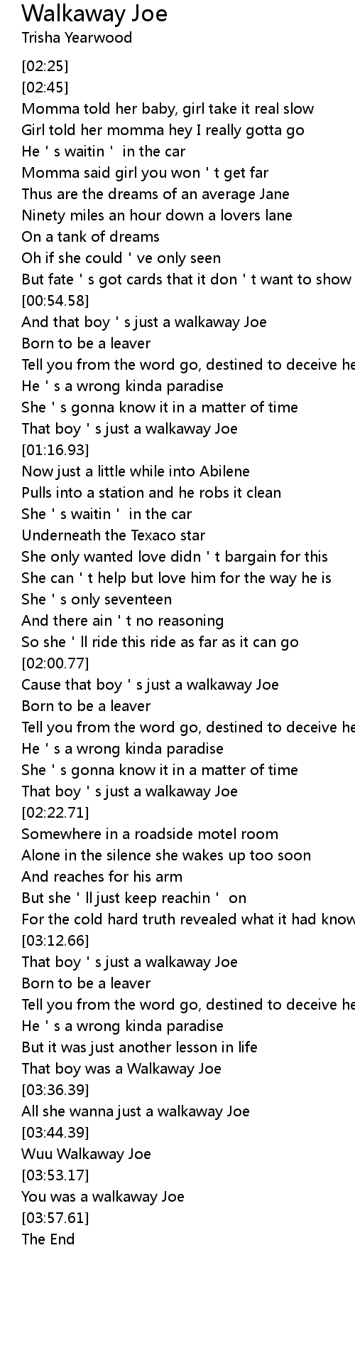 | [02:02.68] | Cause that boy's just a walkaway Joe |