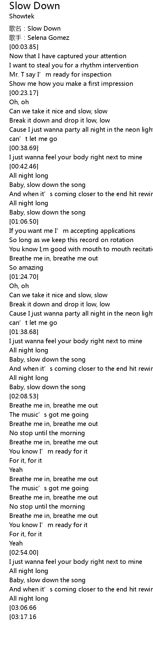 | [03:21.25][03:06.66] | Baby, slow down the song |