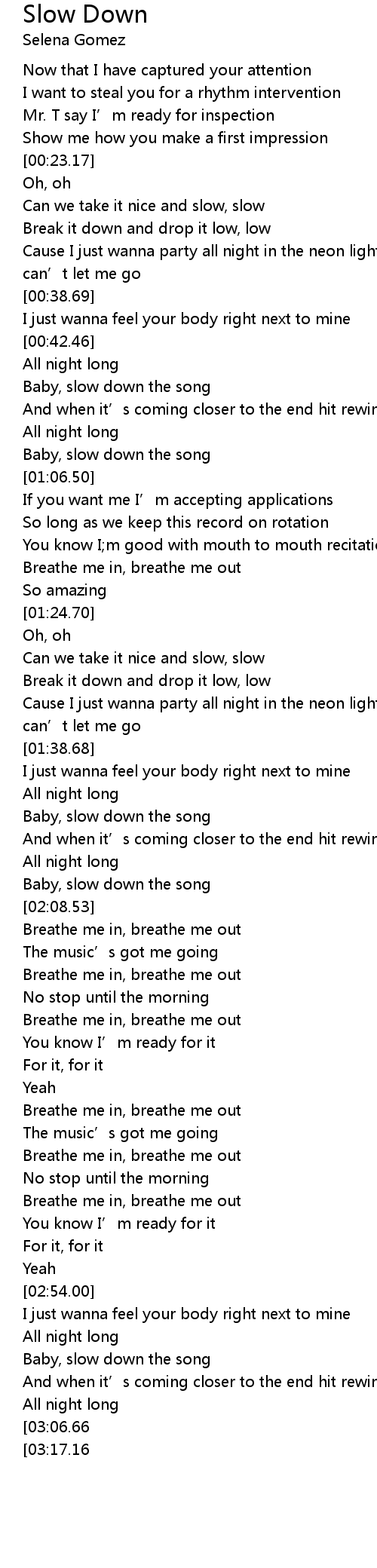 | [03:21.25][03:06.66] | Baby, slow down the song |