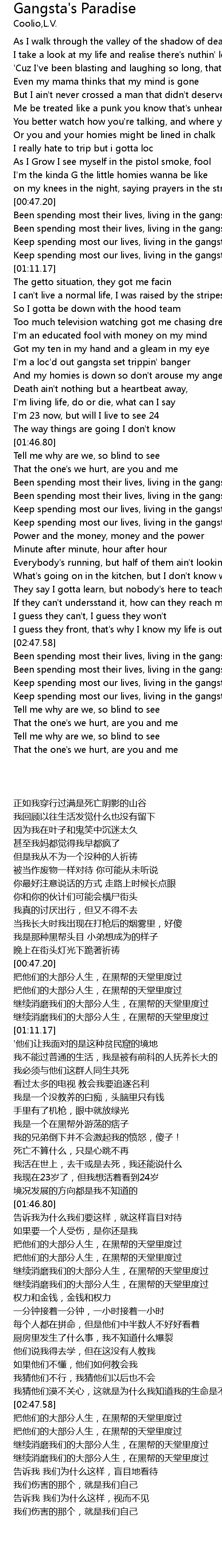 | [02:48.46] | Been spending most their lives, living in the gangsta's paradise |