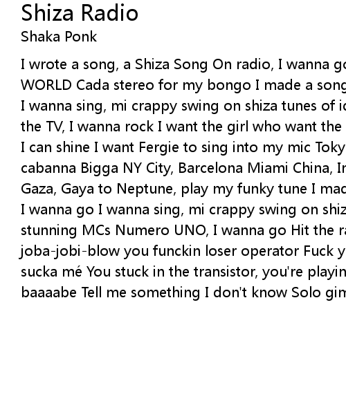 | I wrote a song, a Shiza Song On radio, I wanna go I WANT IT ALL, AROUND THE WORLD Cada stereo for my bongo I made a song, a shiza song, on radio, I wanna go I wanna sing, mi crappy swing on shiza tunes of idiots Letseugo on radio I want the TV, I wanna rock I want the girl who want the singa suck A private party, so I can shine I want Fergie to sing into my mic Tokyo city, Angola, Cuba, Dolce cabanna Bigga NY City, Barcelona Miami China, Inglaterra, Vatican o Panama From Gaza, Gaya to Neptune, play my funky tune I made a song, a shiza song, on radio, I wanna go I wanna sing, mi crappy swing on shiza tunes of idiots I wanna please stunning MCs Numero UNO, I wanna go Hit the radio with my bongo Ho gimme joba-jobi-blow you funckin loser operator Fuck you operator, you gonna sucka sucka mé You stuck in the transistor, you're playing suga suga babe oh suga baaaabe Tell me something I don't know Solo gimme gimme some |