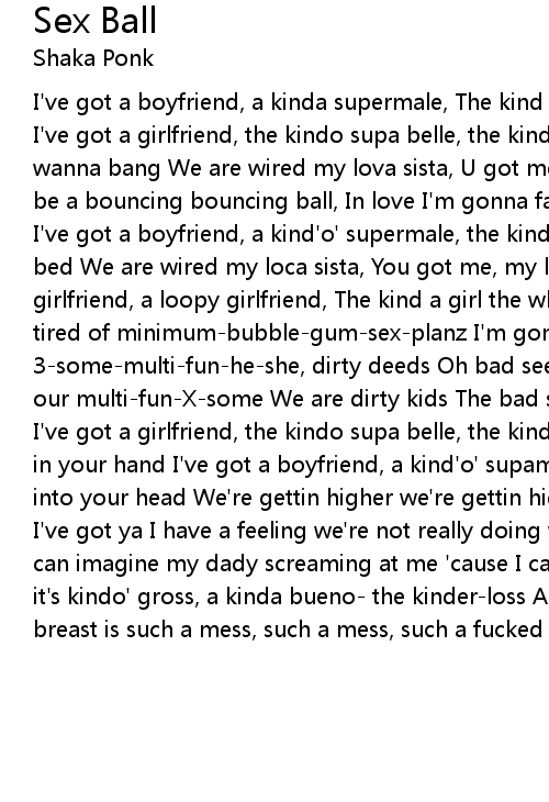 I've got a boyfriend, a kinda supermale, The kind a man u gotta get into ya bed I've got a girlfriend, the kindo supa belle, the kind a girl the whole world wanna bang We are wired my lova sista, U got me, my lova bro' I got ya I wanna be a bouncing bouncing ball, In love I'm gonna fall, gonna fall lika sex ball I've got a boyfriend, a kind'o' supermale, the kind a man u gotta get into your bed We are wired my loca sista, You got me, my loco bro' I got ya I've got a girlfriend, a loopy girlfriend, The kind a girl the whole world's lovin' I'm tired of minimum-bubble-gum-sex-planz I'm gonna fall, gonna fall lika sex ball A 3-some-multi-fun-he-she, dirty deeds Oh bad seeds! Doncha tell your mom about our multi-fun-X-some We are dirty kids The bad seeds wanna dance dance dance I've got a girlfriend, the kindo supa belle, the kind a girl who's coming hard in your hand I've got a boyfriend, a kind'o' supaman, the kind a man u gotta get into your head We're gettin higher we're gettin higher, You got me, my loco bro' I've got ya I have a feeling we're not really doing what we were told to do I can imagine my dady screaming at me 'cause I came down on you It's kindo' gross, it's kindo' gross, a kinda bueno- the kinder-loss A silver cross on a naked breast is such a mess, such a mess, such a fucked up mess hey... |