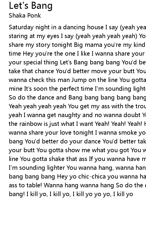 Saturday night in a dancing house I say (yeah yeah yeah yeah) Storming boys staring at my eyes I say (yeah yeah yeah yeah) You're the one I like I wanna share my story tonight Big mama you're my kind Gimme a part of your precious time Hey you're the one I like I wanna share your love tonight I wanna smoke your special thing Let's Bang bang bang You'd better do your dance You'd better take that chance You'd better move your butt You gotta show me what you got You wanna check this man Jump on the line You gotta shake that ass If you wanna have mine It's soon the perfect time I'm sounding lighter You wanna hang, wanna hang So do the dance and Bang bang bang bang bang Do the dance mate and I lose cabeza Yeah yeah yeah yeah You get my ass with the troubleshoot styla Yeah yeah yeah yeah I wanna get naughty and no wanna doubt Yeah yeah yeah yeah The boys over the rainbow is just what I want Yeah! Yeah! Yeah! Hey you're the one I like I wanna share your love tonight I wanna smoke your special thing Let's Bang bang bang You'd better do your dance You'd better take that chance You'd better move your butt You gotta show me what you got You wanna check this man Jump on the line You gotta shake that ass If you wanna have mine It's soon the perfect time I'm sounding lighter You wanna hang, wanna hang So do the dance and Bang bang bang bang bang Hey yo chic-chica you wanna hang out with the jerk? So bring your ass to table! Wanna hang wanna hang So do the dance and Bang bang bang bang bang! I kill yo, I kill yo, I kill yo yo yo, I kill yo |