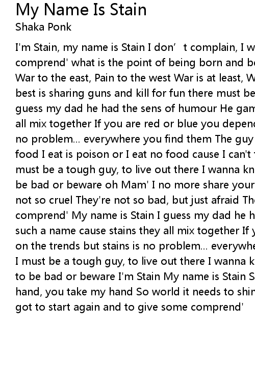| I'm Stain, my name is Stain I don’t complain, I won't complain Do you comprend' what is the point of being born and being gone there must be a reason War to the east, Pain to the west War is at least, What we do 'best What we do best is sharing guns and kill for fun there must be a reason My name is Stain I guess my dad he had the sens of humour He gamme such a name cause stains they all mix together If you are red or blue you depend on the trends but stains is no problem... everywhere you find them The guy next door, is such a whore the food I eat is poison or I eat no food cause I can't find a store Ma mama says I must be a tough guy, to live out there I wanna know why ma mama says you got to be bad or beware oh Mam' I no more share your point of view I know that bros are not so cruel They're not so bad, but just afraid The best to do is to give some comprend' My name is Stain I guess my dad he had the sens of humour He gamme such a name cause stains they all mix together If you are red or blue you depend on the trends but stains is no problem... everywhere you find them Ma mama says I must be a tough guy, to live out there I wanna know why ma mama says you got to be bad or beware I'm Stain My name is Stain So don't complain And take my hand, you take my hand So world it needs to shine again My little friend we've got to start again and to give some comprend' |