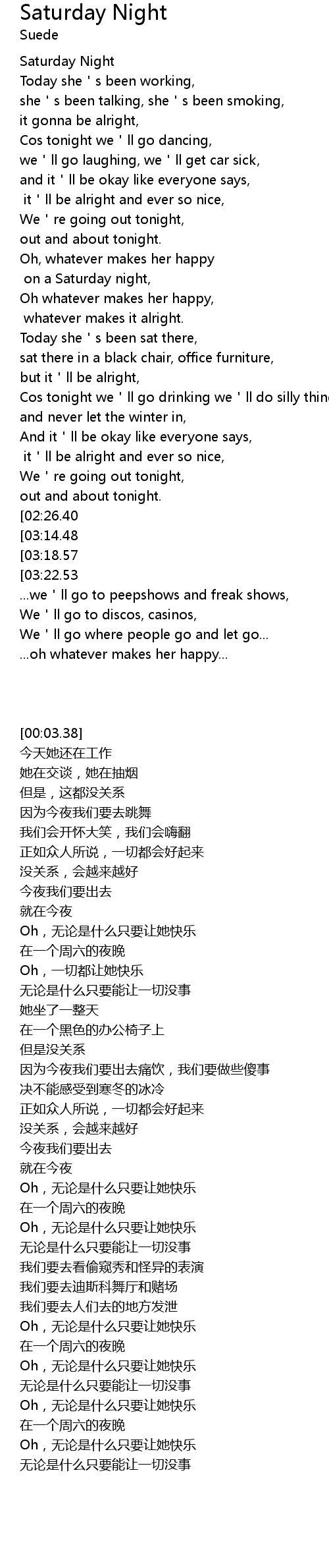 | [03:30.97][03:14.48][02:30.47] | on a Saturday night, |