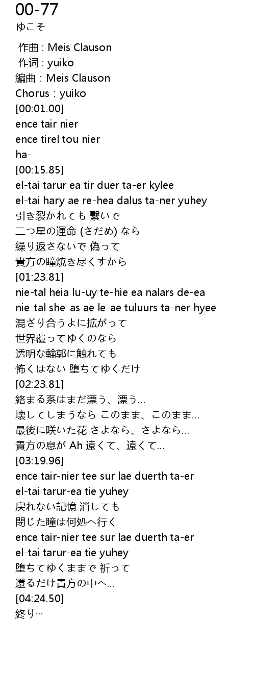 | [03:07.41] | 貴方の息が Ah 遠くて、遠くて… |