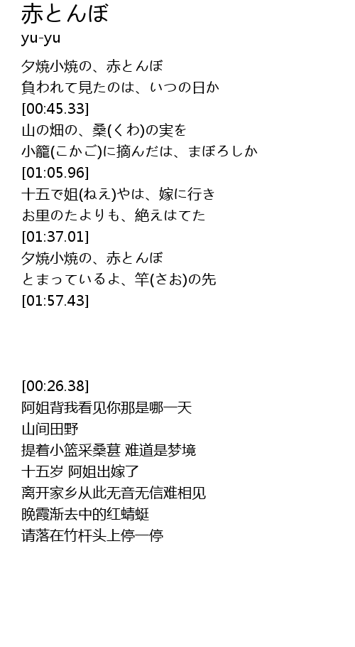 | [00:26.38] | 夕焼小焼の、赤とんぼ |