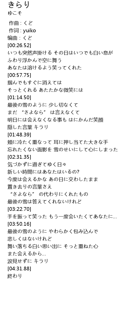 | [04:04.46] | 舞い落ちる白い思い出に そっと重ねた心 |