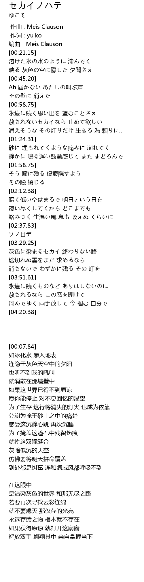 | [03:29.25] | 灰色に染まるセカイ 終わりない路 |