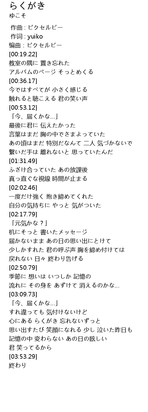 | [02:25.96] | 届かないまま あの日の思い出にとけて |