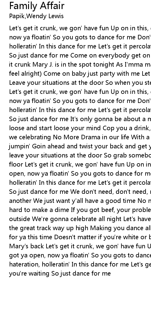 Let's get it crunk, we gon' have fun Up on in this, dance for me We got ya open, now ya floatin' So you gots to dance for me Don't need no hateration, holleratin' In this dance for me Let's get it percolatin', while you're waiting So just dance for me Come on everybody get on up Cause you know we gots to get it crunk Mary J. is in the spot tonight As I'mma make it feel alright (Make it feel alright) Come on baby just party with me Let loose and set your body free Leave your situations at the door So when you step inside jump on the floor Let's get it crunk, we gon' have fun Up on in this, dance for me We got ya open, now ya floatin' So you gots to dance for me Don't need no hateration, holleratin' In this dance for me Let's get it percolatin', while you're waiting So just dance for me It's only gonna be about a matter of time Before you get loose and start loose your mind Cop you a drink, go head and rock your ice Cause we celebrating No More Drama in our life With a great track pumpin', everybody's jumpin' Goin ahead and twist your back and get your body bumpin' I told you leave your situations at the door So grab somebody and get your ass on the dance floor Let's get it crunk, we gon' have fun Up on in this, dance for me We got ya open, now ya floatin' So you gots to dance for me Don't need no hateration, holleratin' In this dance for me Let's get it percolatin', while you're waiting So just dance for me We don't need, don't need, no haters Just try to love one another We just want y'all have a good time No more drama in your life Work real hard to make a dime If you got beef, your problem, not mine Leave all that BS outside We're gonna celebrate all night Let's have fun, tonight, no fights Turn the great track way up high Making you dance all night and I Got some real heat for ya this time Doesn't matter if you're white or black Let's get crunk cuz Mary's back Let's get it crunk, we gon' have fun Up on in this, dance for me We got ya open, now ya floatin' So you gots to dance for me Don't need no hateration, holleratin' In this dance for me Let's get it percolatin', while you're waiting So just dance for me |