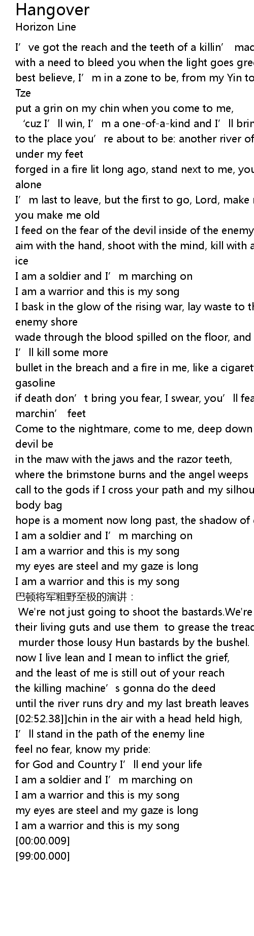 | [00:57.78] | I feed on the fear of the devil inside of the enemy faces in my sights |