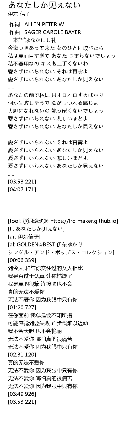 | [02:57.619] | 愛さずにいられない あなたしか見えない |