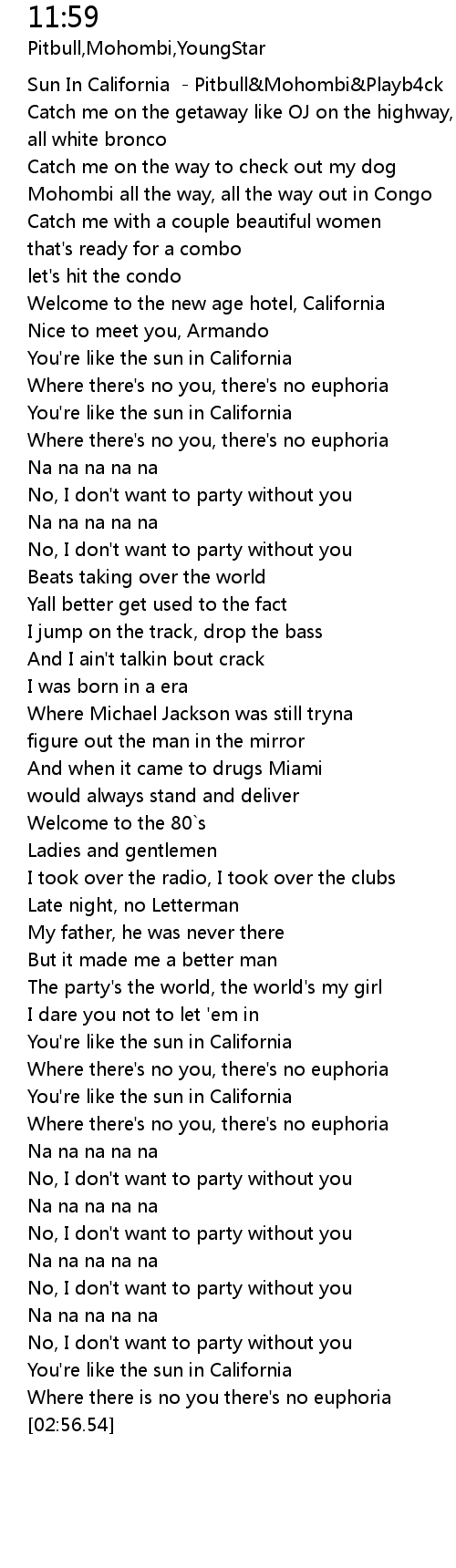 | [00:00.57] | Sun In California - Pitbull&Mohombi&Playb4ck |