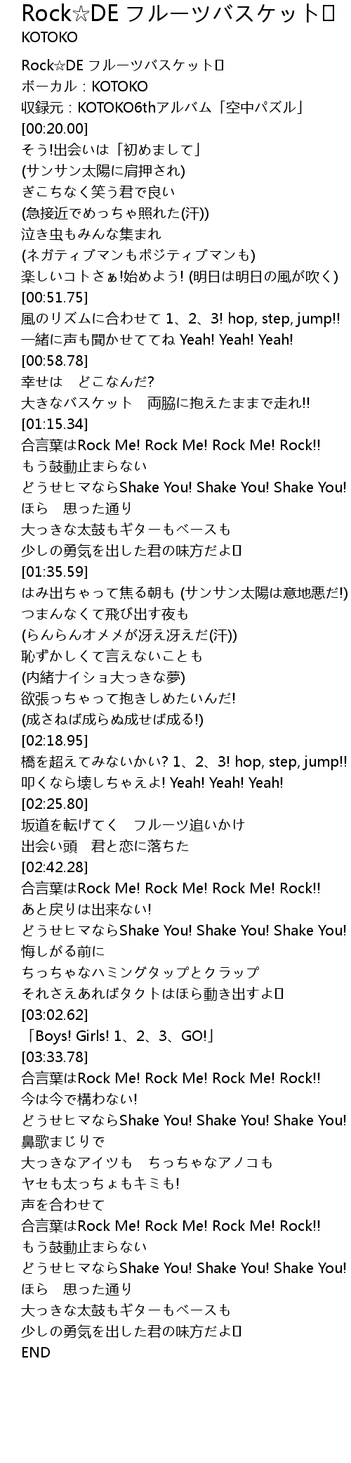 | [02:42.41] | 合言葉はRock Me! Rock Me! Rock Me! Rock!! |