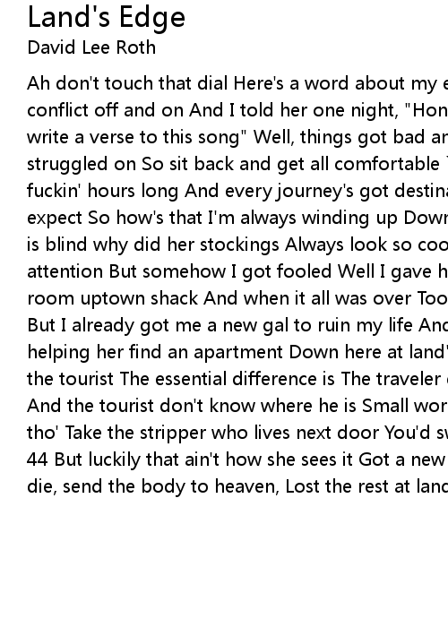 Ah don't touch that dial Here's a word about my ex-girlfriend Towards the end conflict off and on And I told her one night, "Honey every time we fight I'll write a verse to this song" Well, things got bad and things got worse Still I struggled on So sit back and get all comfortable `Cause this little tunes six fuckin' hours long And every journey's got destinations Which the traveler can't expect So how's that I'm always winding up Down here at land's edge? Now if love is blind why did her stockings Always look so cool? Now I know I was paying attention But somehow I got fooled Well I gave her seven children And a twelve room uptown shack And when it all was over Took a dozen lawyers To get half back But I already got me a new gal to ruin my life And she might just yet, So I'm helping her find an apartment Down here at land's edge Now take the traveler and the tourist The essential difference is The traveler don't know where he's goin' And the tourist don't know where he is Small world till they lose your luggage, tho' Take the stripper who lives next door You'd swear this kid was 21 goin' on 44 But luckily that ain't how she sees it Got a new tattoo that says: "when I die, send the body to heaven, Lost the rest at land's edge" |