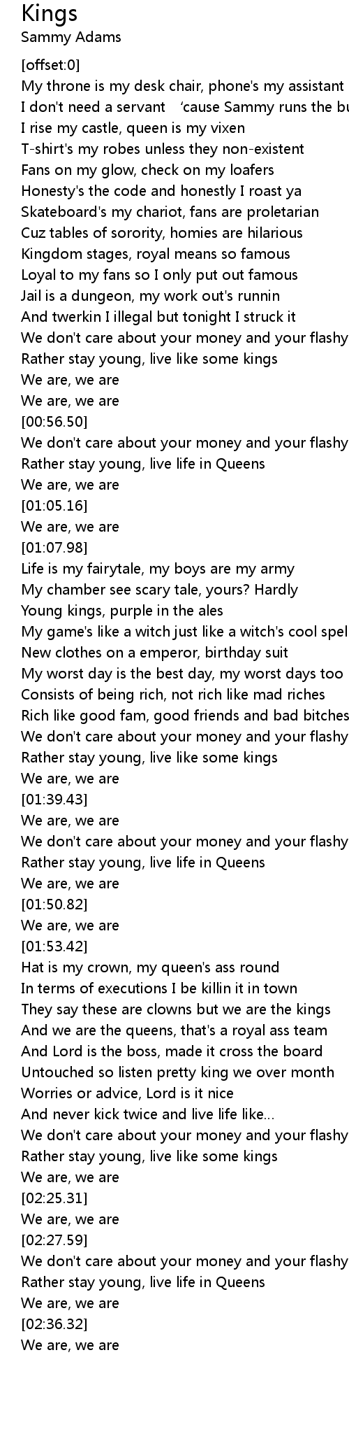 | [02:00.02] | They say these are clowns but we are the kings |