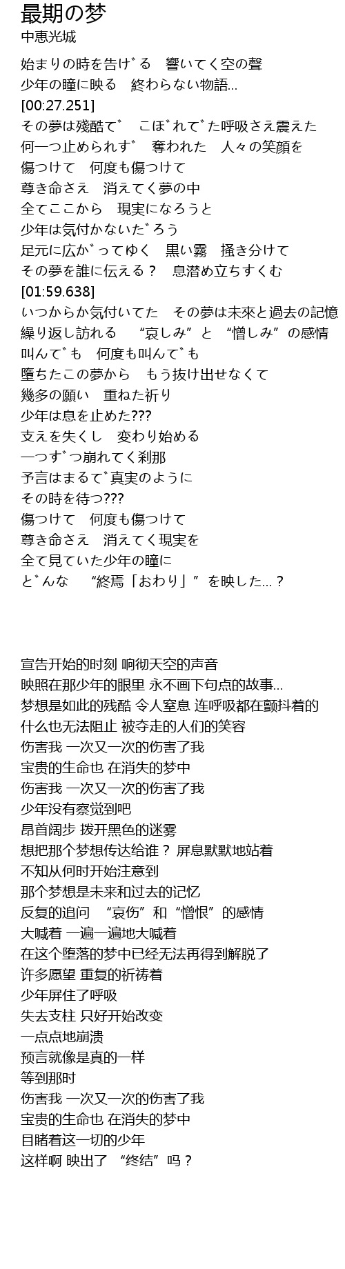 | [01:12.163] | 尊き命さえ 消えてく夢の中 |
