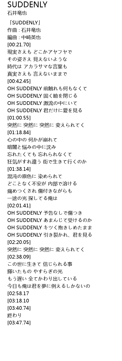 | [00:55.67] | OH SUDDENLY 君だけに愛を見る |