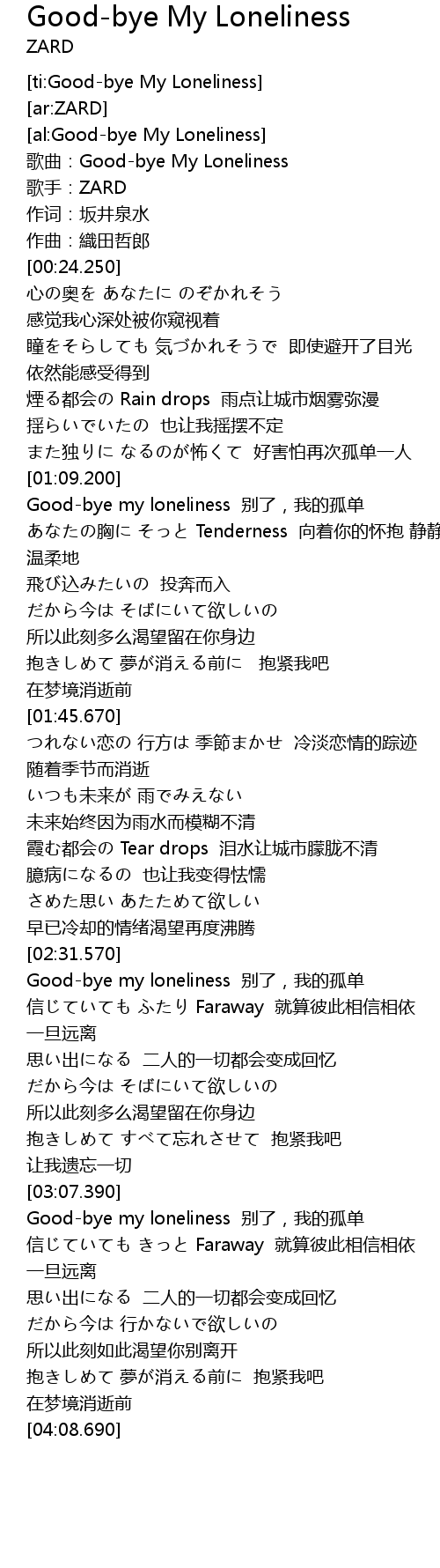| [00:04.000] | 歌曲:Good-bye My Loneliness |