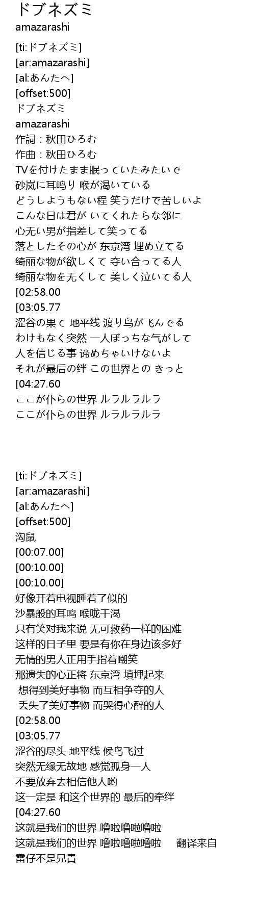 | [01:49.09][02:58.00][04:12.00] | 岚が来る前に 早く归っておいでよ |