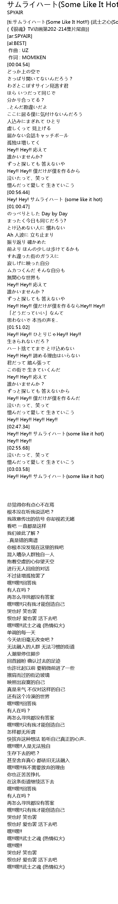 | [ti:サムライハート(Some Like It Hot!!) (武士之心(Some Like It Hot!!)) (《银魂》TV动画第202-214集片尾曲)] | |