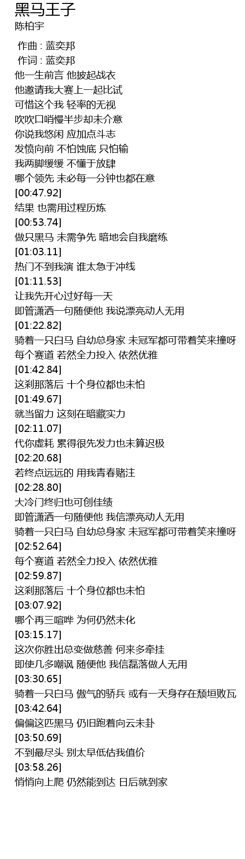 | [02:40.66] | 骑着一只白马 自幼总身家 未冠军都可带着笑来撞呀 |