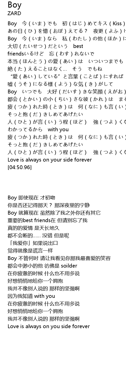 | [02:20.26] | Boy いつでも 大好(だいす)きな笑顔(えがお)を見(み)せて |