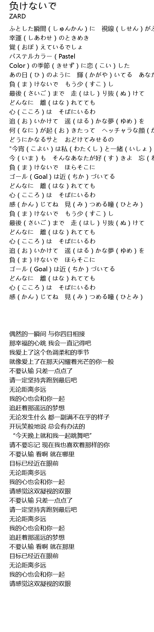 | [03:02.03] | 負(ま)けないで ほらそこに |