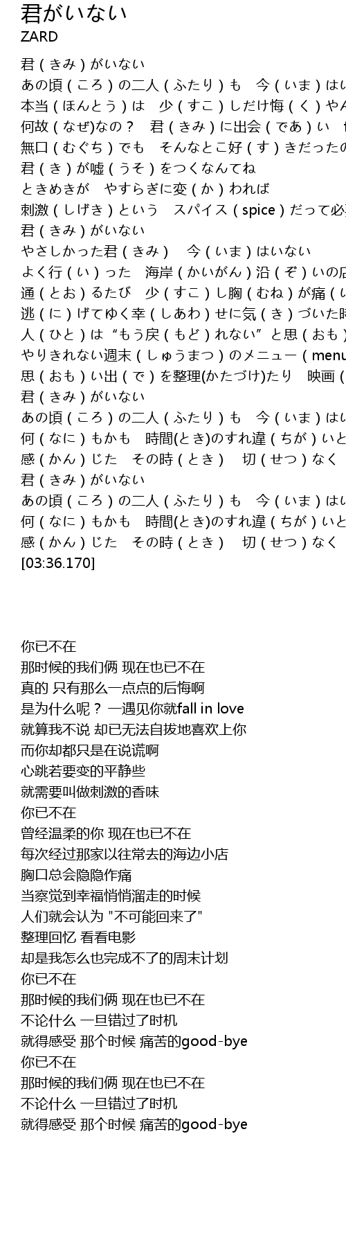 | [02:23.890] | 君(きみ)がいない |