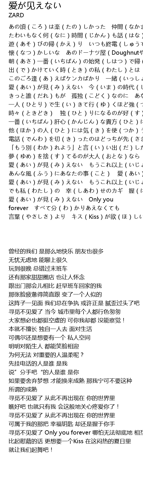 | [03:06.21] | 愛(あい)が見(み)えない Only you forever すべて分(わ)かりあえなくても |