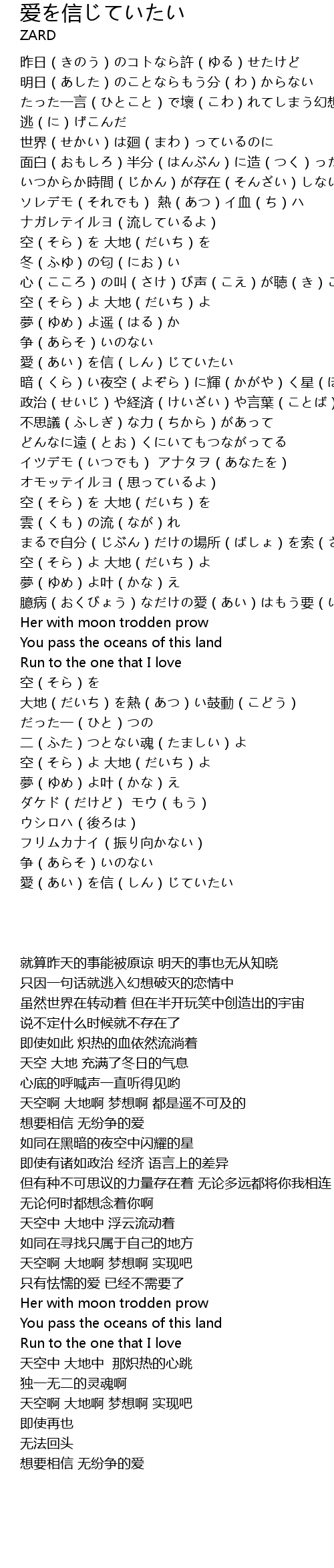 | [01:56.81] | 争(あらそ)いのない 愛(あい)を信(しん)じていたい |