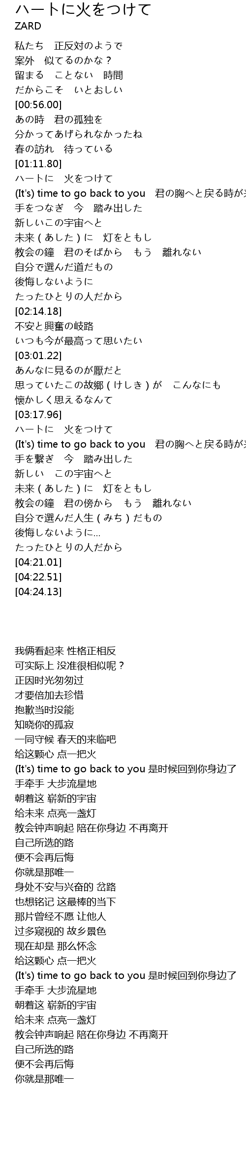 [03:23.74] (It's) time to go back to you 君の胸へと戻る時が来た