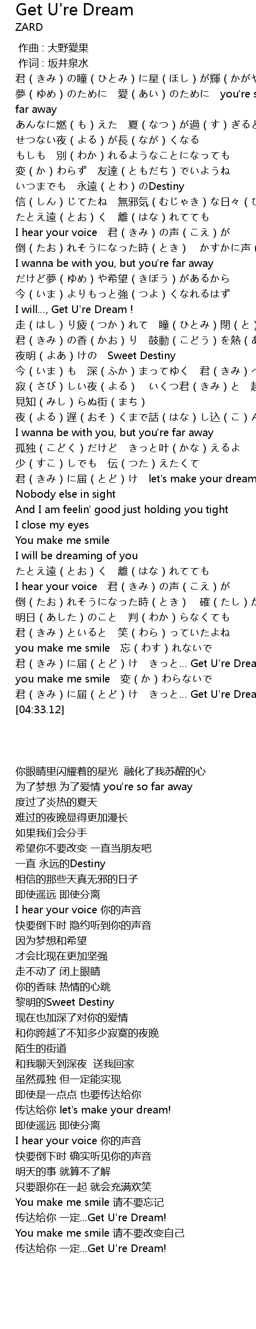 | [04:32.12] | 君(きみ)に届(とど)け きっと… Get U're Dream ! |