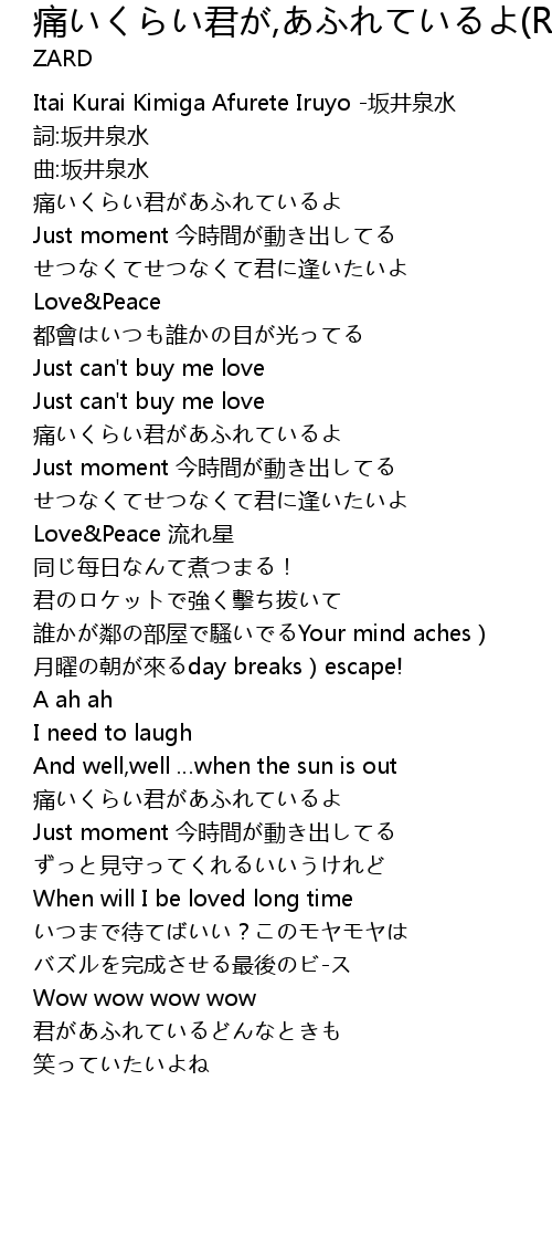 | [00:01.650] | Itai Kurai Kimiga Afurete Iruyo -坂井泉水 |