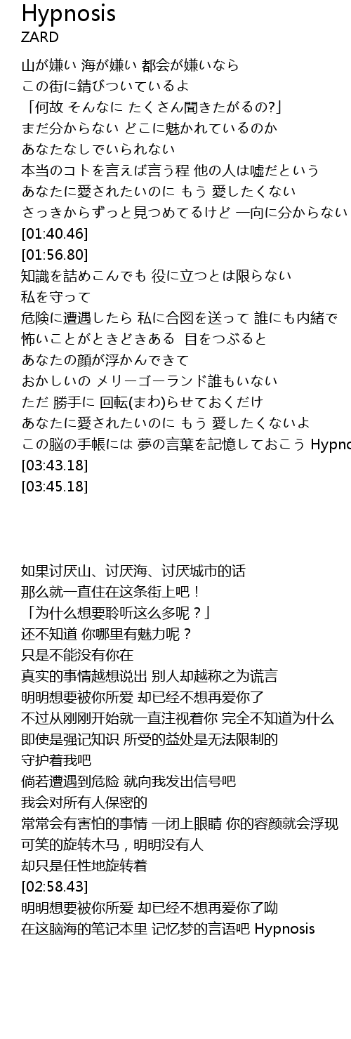 | [03:25.70] | nao shǒu zhàng mèng yán yè jì yì Hypnosis |