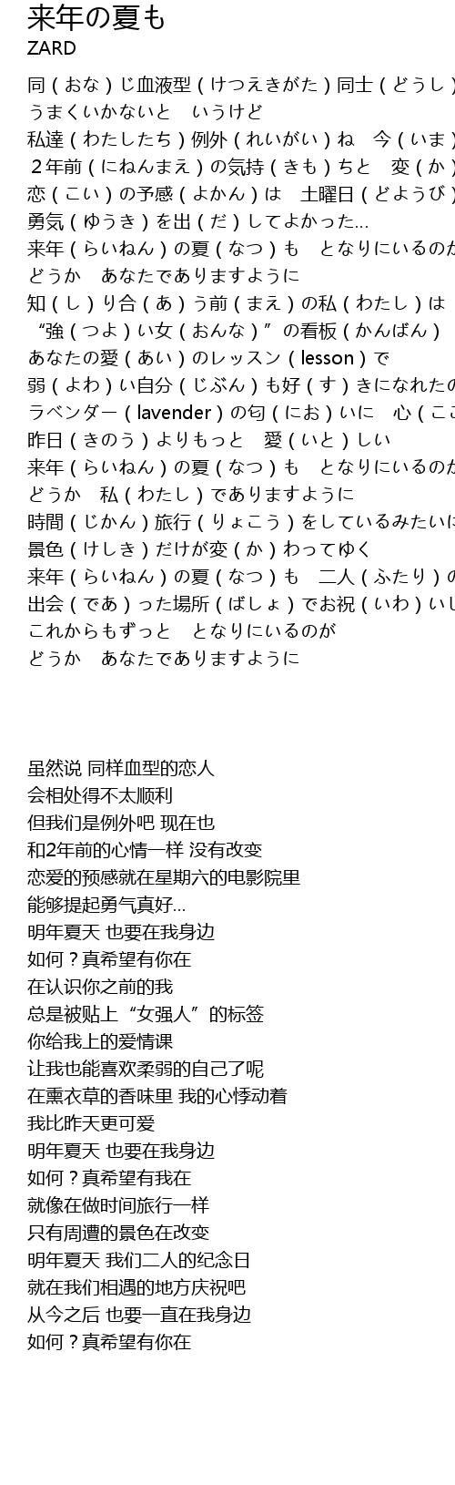 | [03:21.62] | 来年(らいねん)の夏(なつ)も 二人(ふたり)の記念日(きねんび) |