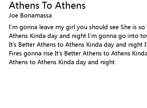 | I'm gonna leave my girl you should see She is so fine It's Better Athens to Athens Kinda day and night I'm gonna go into town Going to try to flag a ride It's Better Athens to Athens Kinda day and night I'm gonna watch the sun come up Fires gonna rise It's Better Athens to Athens Kinda day and night It's Better Athens to Athens Kinda day and night |