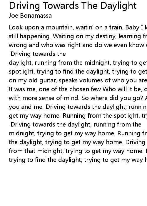 Look upon a mountain, waitin' on a train. Baby I know what's wrong, and it's still happening. Waiting on my destiny, learning from my abilities. Who was wrong and who was right and do we even know why we are fighting? So take your eyes off of me and look upon the churning sea. [Chorus:] Driving towards the daylight, running from the midnight, trying to get my way home. Running from the spotlight, trying to find the daylight, trying to get back home. Rusty strings on my old guitar, speaks volumes of who you are. So never did I think it was you It was me, one of the chosen few Who will it be, oh the next time? Hopefully one with more sense of mind. So where did you go? Always will see, it's a story of you and me. Driving towards the daylight, running from the midnight, trying to get my way home. Running from the spotlight, trying to find the daylight, trying to get back home. [Solo] Driving towards the daylight, running from the midnight, trying to get my way home. Running from the spotlight, trying to find the daylight, trying to get my way home. Driving towards the daylight, running from that midnight, trying to get my way home. Running from the spotlight, trying to find the daylight, trying to get my way home. |