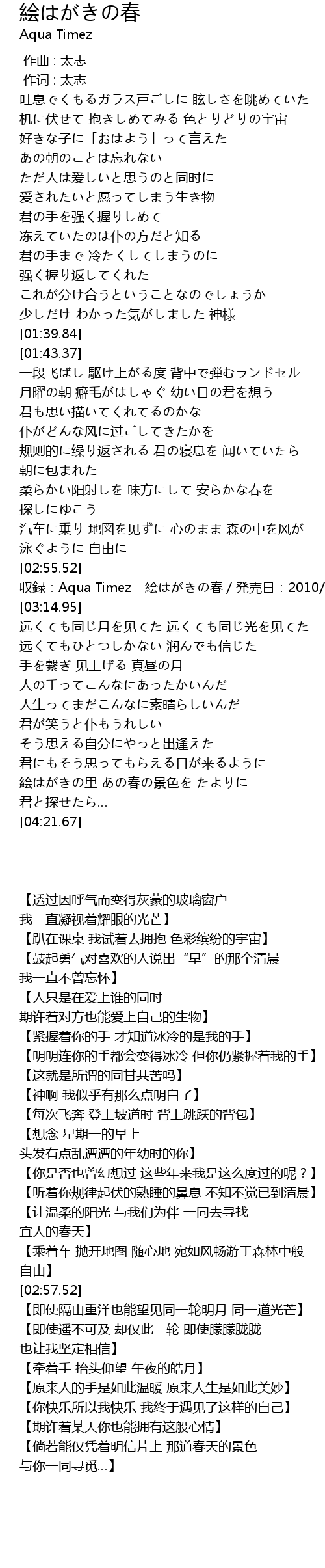 | [02:57.52] | 収録:Aqua Timez - 絵はがきの春/発売日:2010/01/27 |