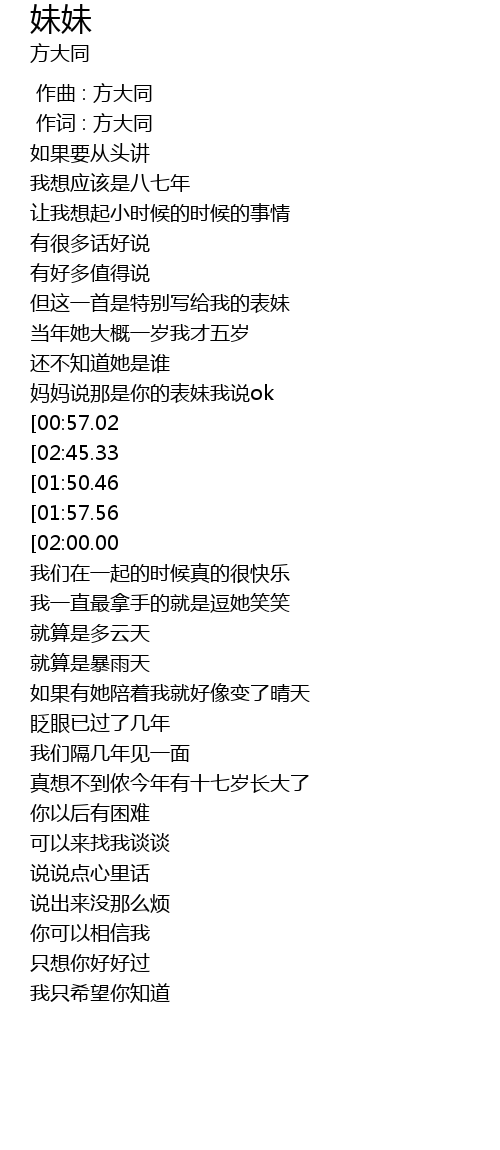 | [00:58.16][01:57.56][02:54.87][03:13.94][03:33.32] | 多美丽的妹妹 |