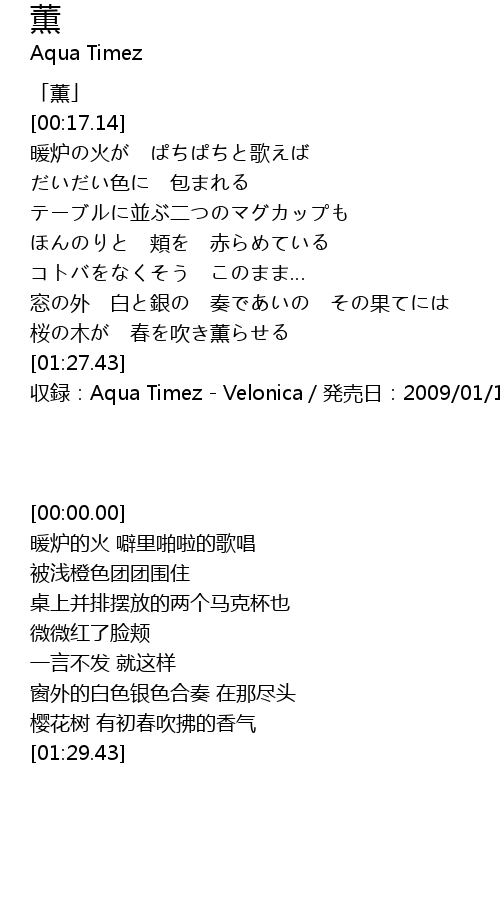 | [01:29.43] | shōu lù: Aqua Timez Velonica fā mài rì: 2009 01 14 |