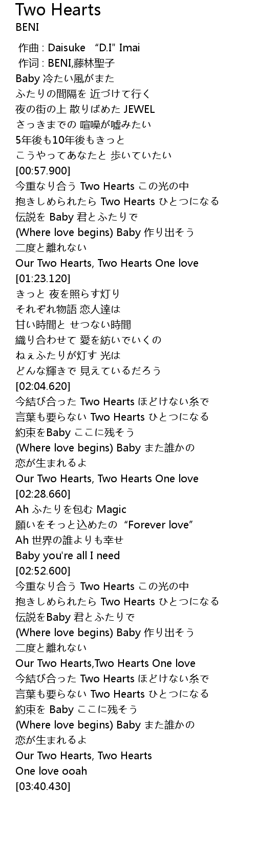 | [02:11.860] | 言葉も要らない Two Hearts ひとつになる |