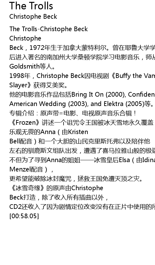 | [00:49.35] | 《冰雪奇缘》的原声由Christophe Beck打造,除了收入所有插曲以外, |