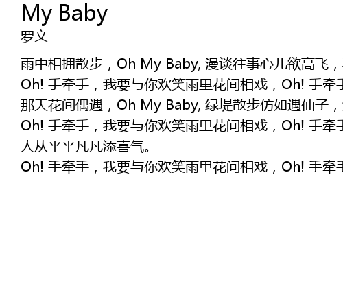 | yǔ zhōng xiāng yōng sàn bù, Oh My Baby, màn tán wǎng shì xīn ér yù gāo fēi, yào jiè sī sī xiǎo yǔ biān zhī ài de shī, yī jù xīn shī zhī lái zèng yǔ nǐ. qíng rén néng cóng píng fán tiān xǐ qì. | |