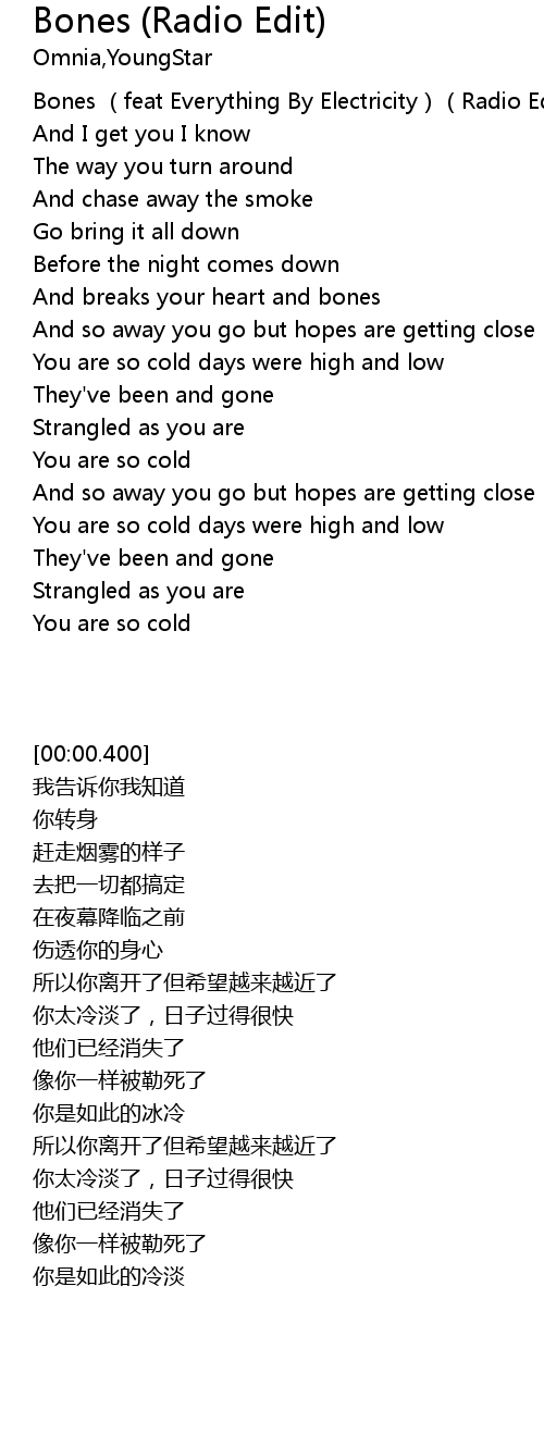 | [00:00.400] | Bones (feat Everything By Electricity)(Radio Edit)-Omnia |