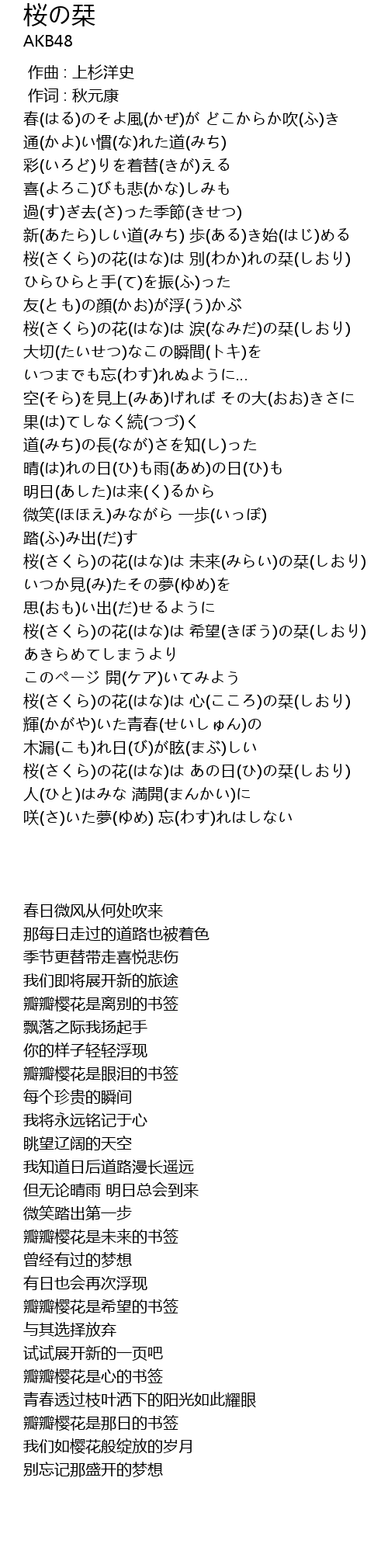 | [00:47.180] | 桜(さくら)の花(はな)は 別(わか)れの栞(しおり) |