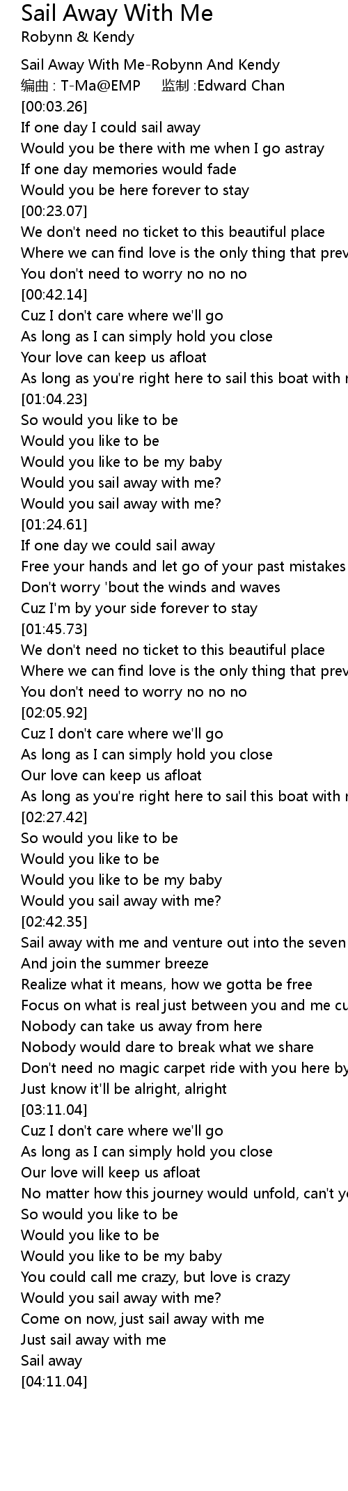 | [00:00.32] | Sail Away With MeRobynn And Kendy |