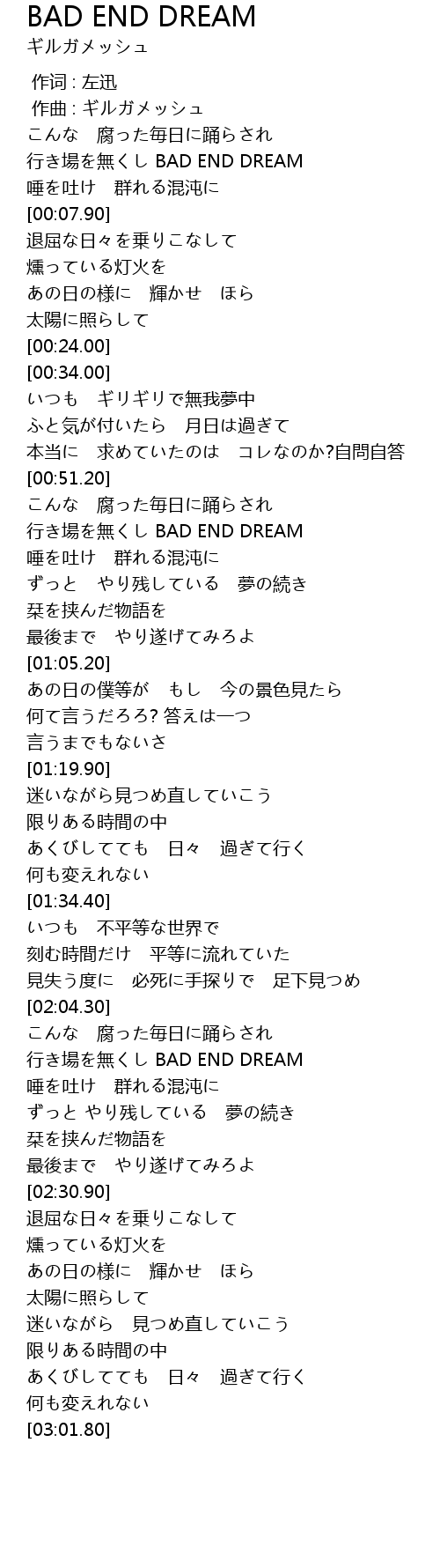 | [00:03.68] | 行き場を無くし BAD END DREAM |