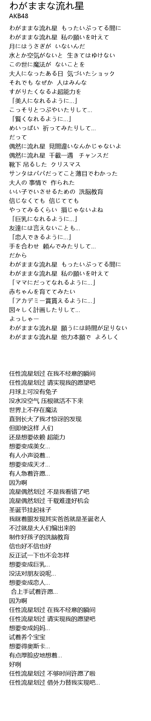 | [00:09.05] | わがままな流れ星 私の願いを叶えて |